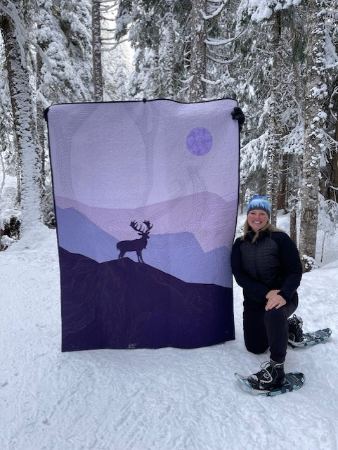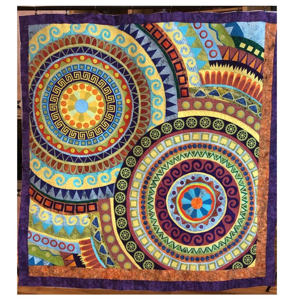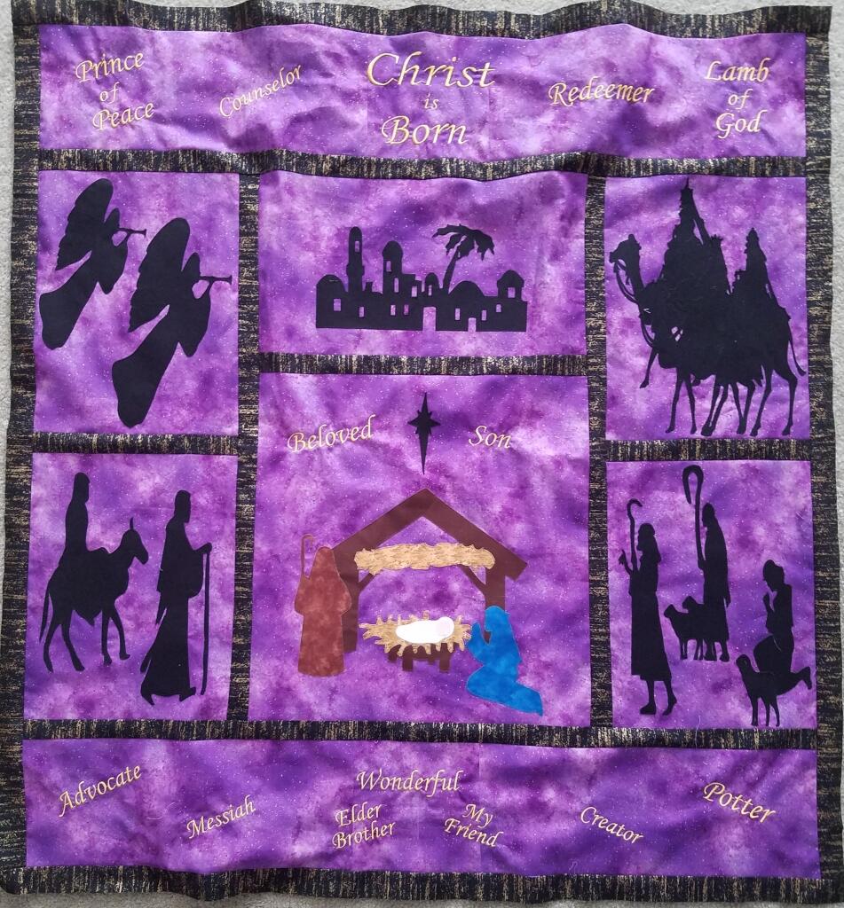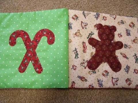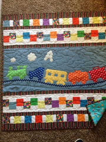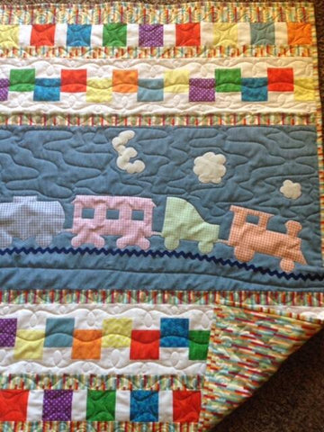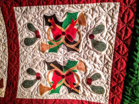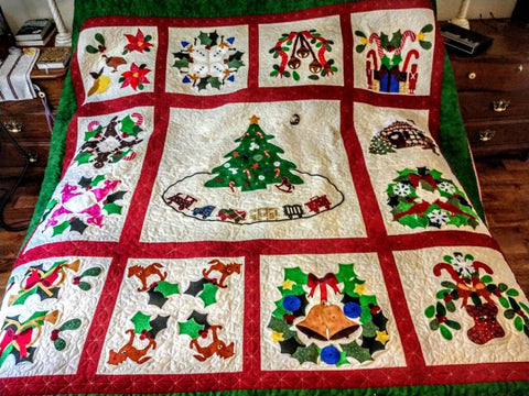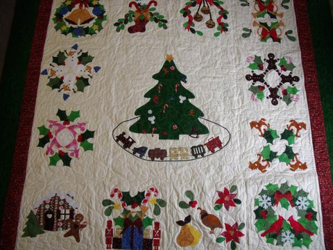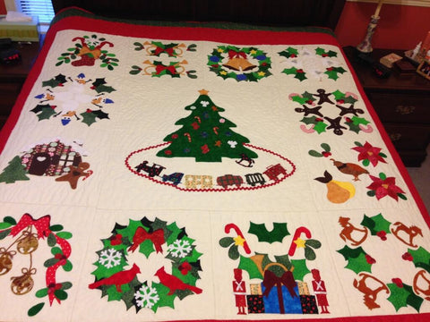 Baltimore Christmas Express quilt designed & appliqued by Carolyn in 2012. The appliques are die cut & laser cut for accuracy. Quilting was done by Robin Hrabik of Candy Apple Quilt, 2013. click on small photo then 'more info' to go to Robin's website